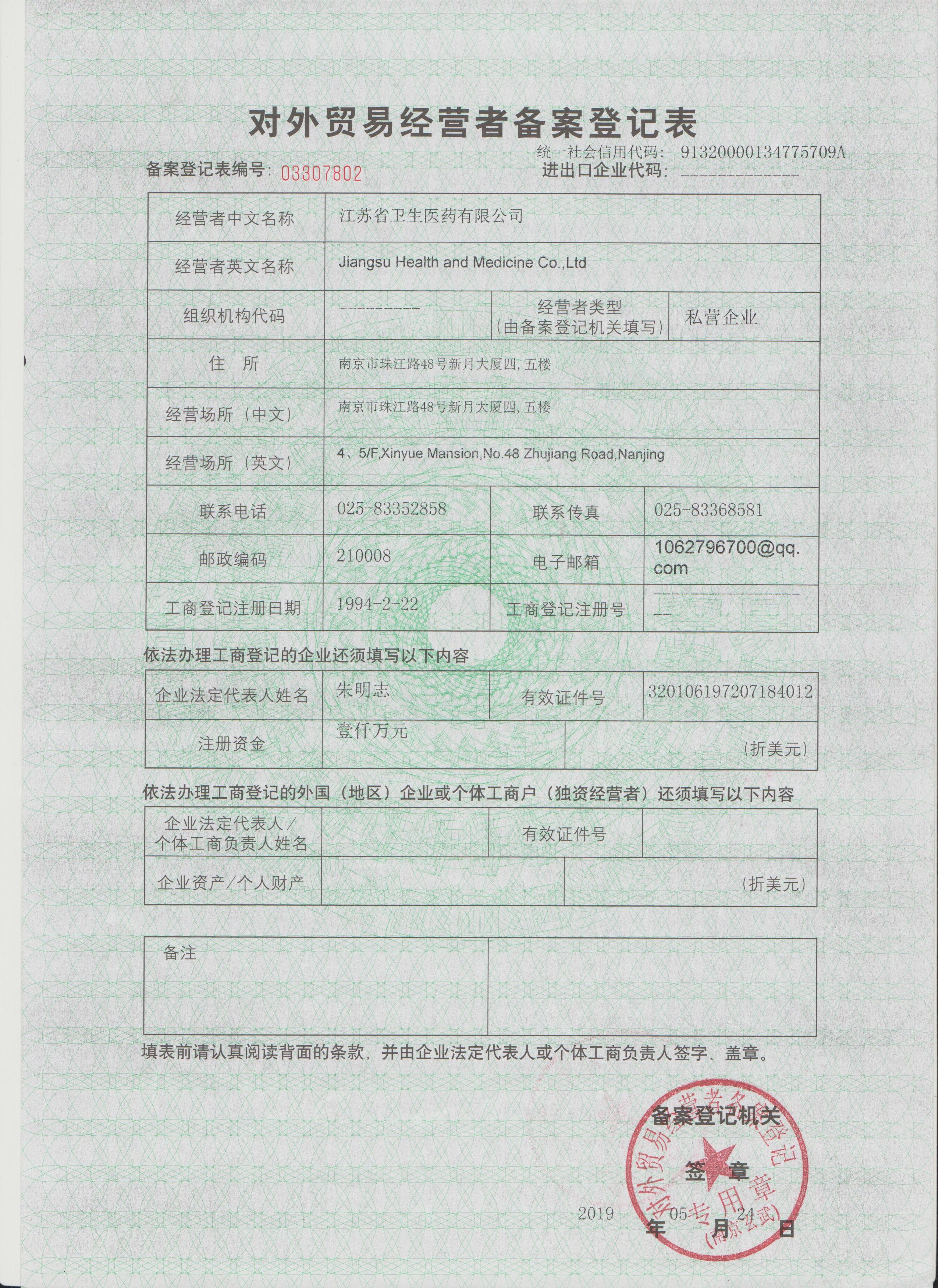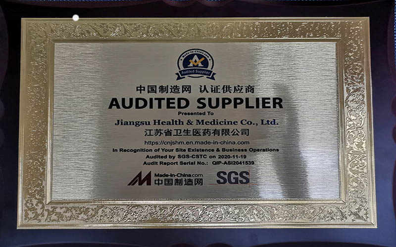Founded in 1994, Jiangsu Health Medicine Co., Ltd. (formerly a state-owned enterprise directly under the Health Department of Jiangsu Province) was restructured into a limited liability company in 2003. The company has the right of import and export, with the major business covering traditional Chinese medicine, chemical medicine, biological products and medical devices. In November 2020, the company passed the SGS certification of Made-in-China.com. In December, 2020, it was listed as “Critical Materials Support Unit in Jiangsu Province” by Jiangsu Provincial Food and Strategic Reserves Administration. The company owns nearly 3,000 square meters of office and storage space (own property rights).